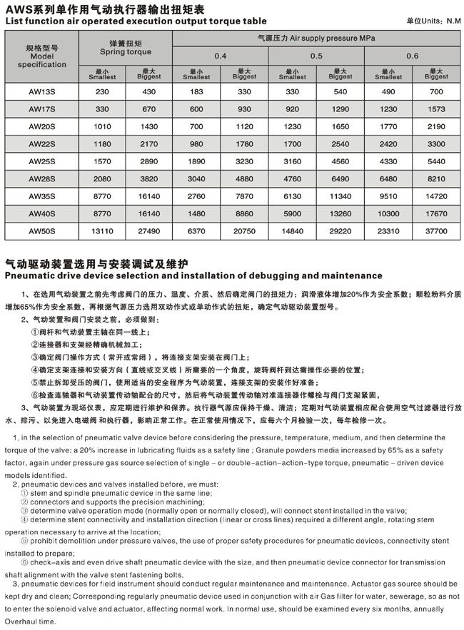 AW系列氣動執(zhí)行器分為雙作用式和單作用式(彈簧復(fù)位),兩個公體氣缸,輸出扭矩大,動作靈活平衡;活塞桿鍍硬鉻,有很好的耐磨性;所有滑動部件之間配有無油潤滑軸和導(dǎo)向環(huán)以降低摩擦系數(shù),延長使用壽命AW系列氣動執(zhí)行器的U器曲線特性輸出扭矩更適用于大口徑球閥等轉(zhuǎn)角行程閥門的啟、閉和調(diào)節(jié),也可用于其它回轉(zhuǎn)運動場合,是實現(xiàn)工業(yè)管道自動化控制的理想裝置。
